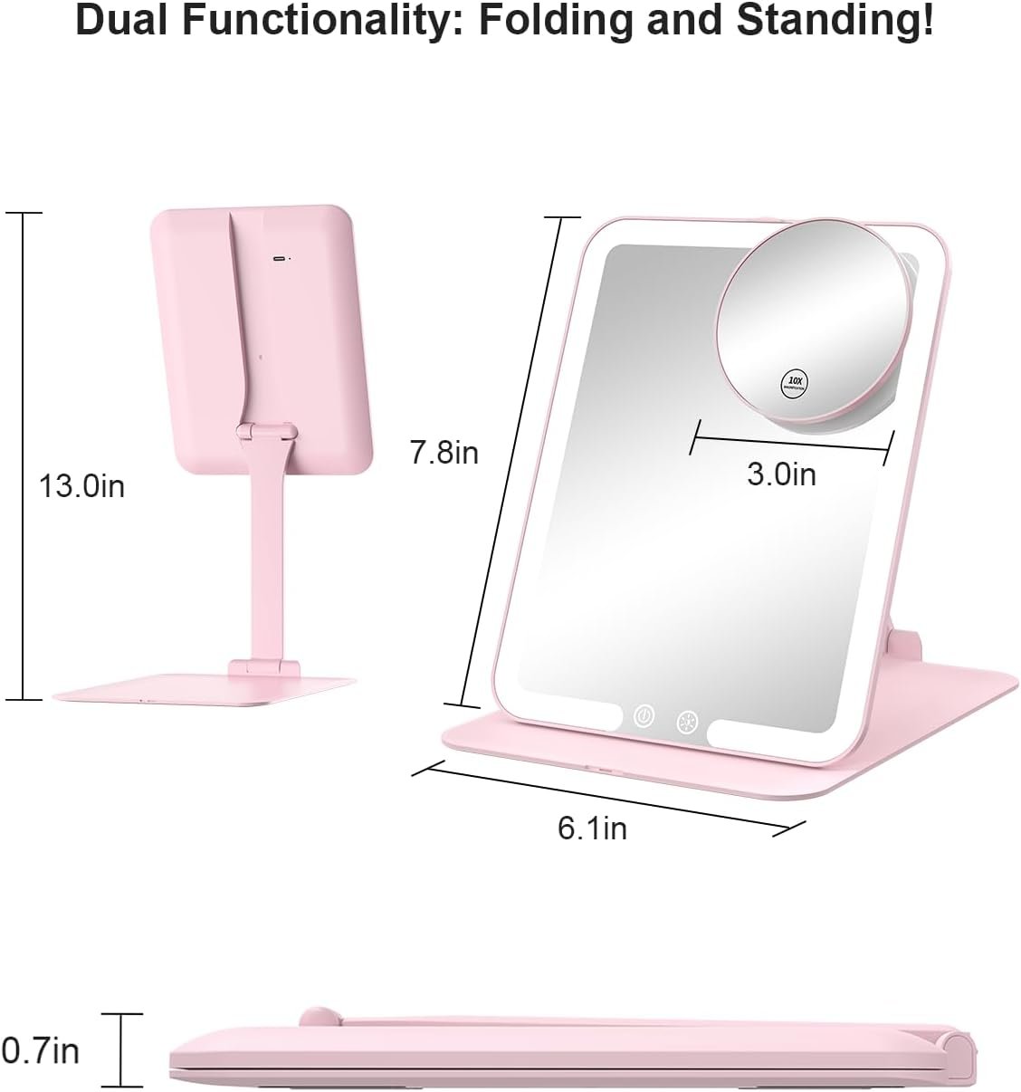 - 【Portable Travel Vanity Mirror】Dimensions: 6.1in*7.8in. Designed to be compact and foldable, the travel mirror with light comes with a velvet storage bag for easy carrying in luggage, handbags, and backpacks